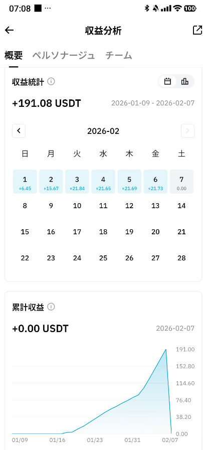 • 2月6日(昨日): +21.73 USDT(約3,259円)