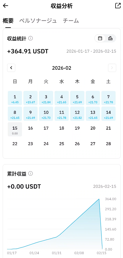 - 2月14日(本日): +21.91 USDT(約3,286円)