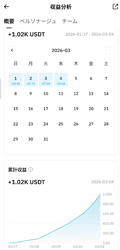 - 累計収益:1.02K USDT(約153,000円)