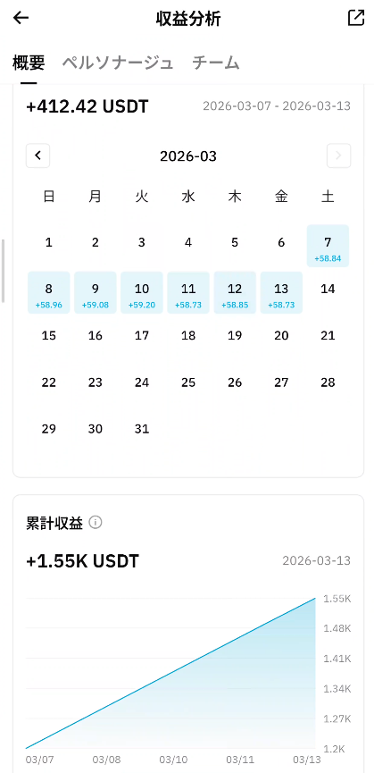 - 累計収益:1.55K USDT(約232,500円)