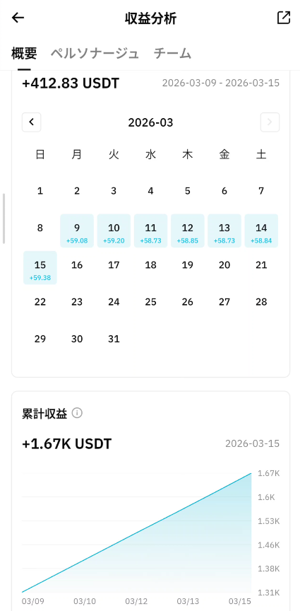 - 累計収益:1.67K USDT(約250,500円)