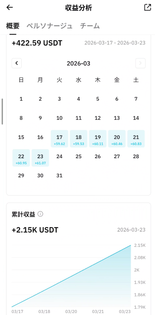 • 3月23日(本日):+61.07 USDT(約9,160円)