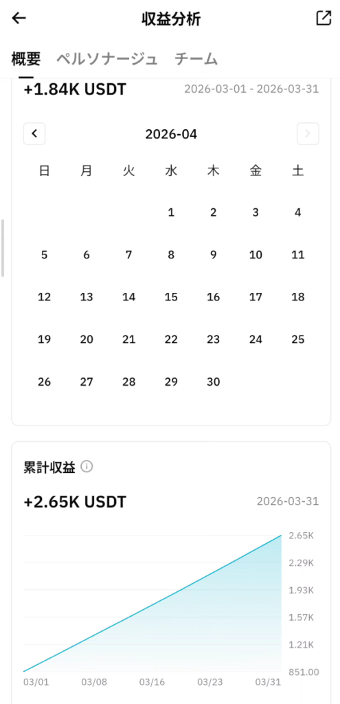 • 3月末時点の累計収益:+2.65K USDT(約397,500円)