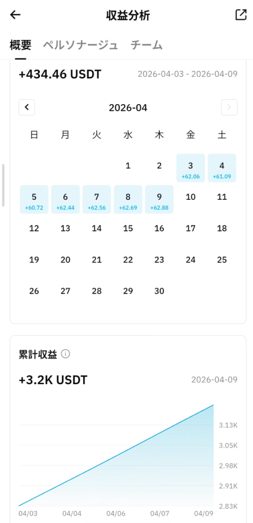 本日の利益は +62.88 USDT。 累計収益は 3.2K USDT、日本円にして約480,000円 に到達しました。 4月に入ってから、1日あたりの収益が 62 USDT台 で極めて安定しているのが分かります。