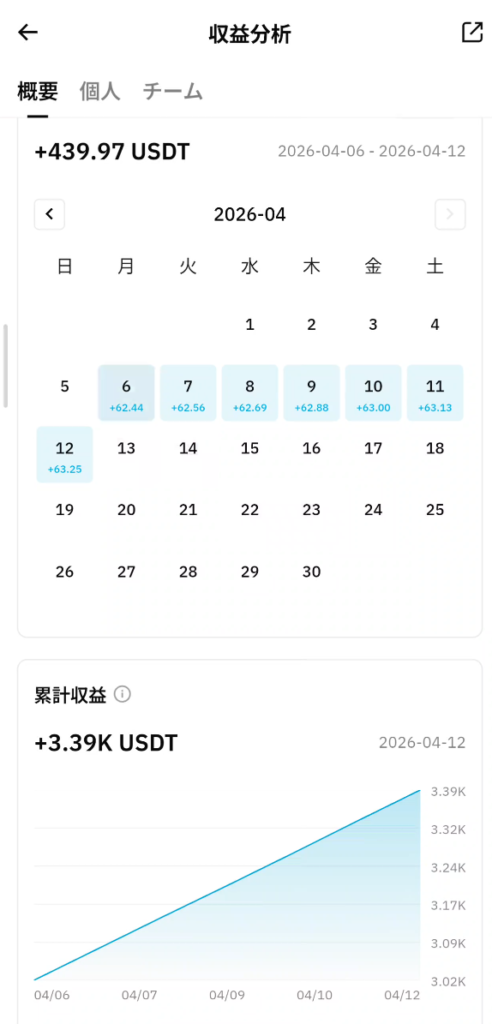 - 4月12日(本日):+63.25 USDT(約9,488円)