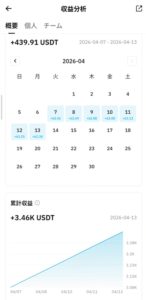 - 4月13日(本日):+62.38 USDT(約9,357円)