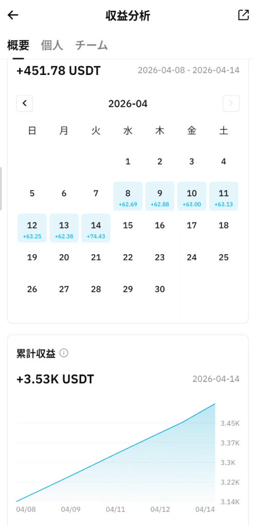 - 4月14日(本日):+74.43 USDT(約11,164円)