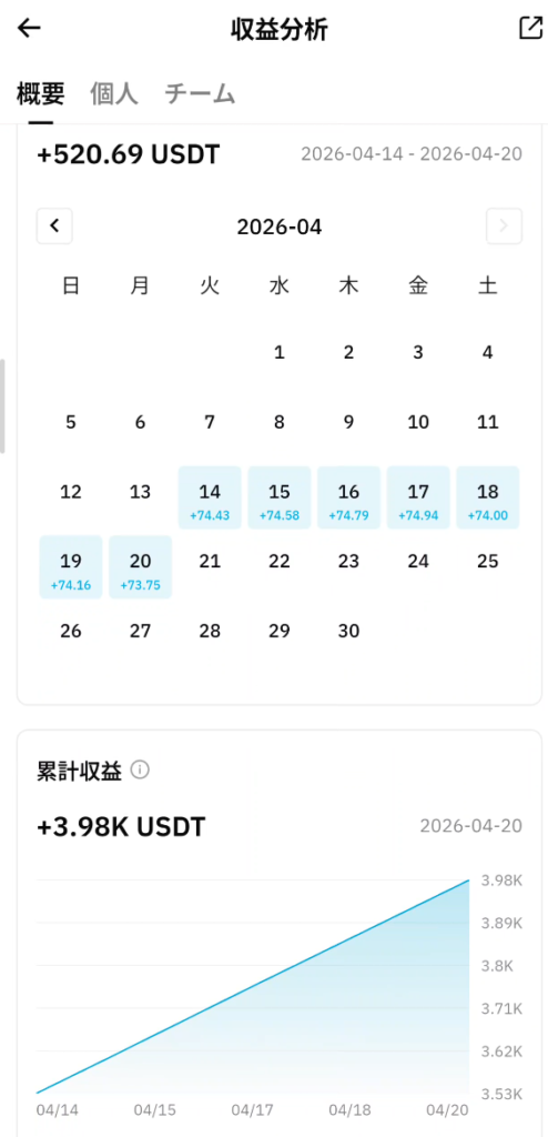 - 4月20日(本日):+74.34 USDT(約11,151円)
