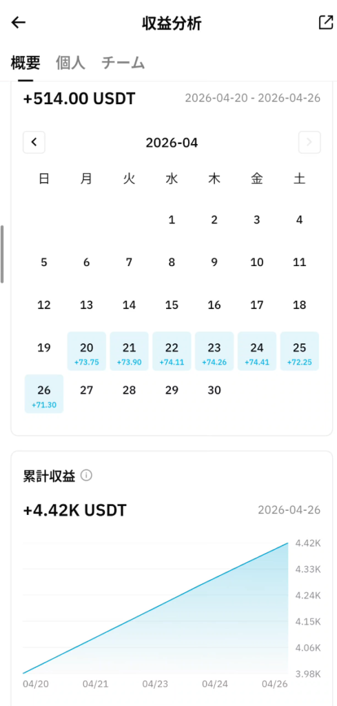 - 4月26日(本日):+71.30 USDT